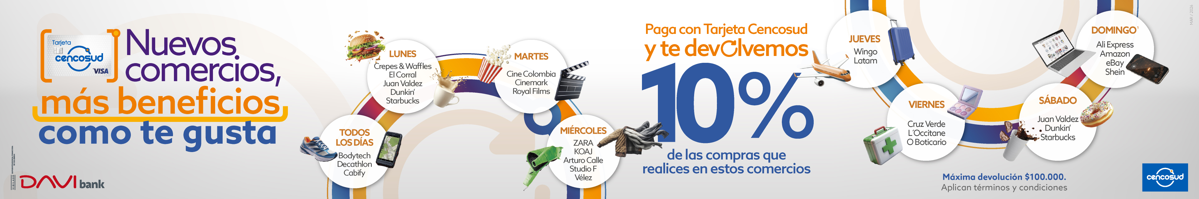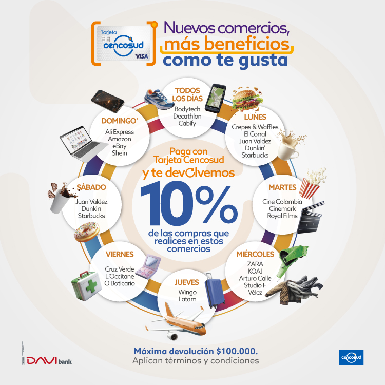 DAVIbank pertenece a Davivienda Group. Banco DAVIbankS.A. Establecimiento Bancario. En el marco de la integración de las operaciones de The Bank of Nova Scotia (“Scotiabank”) en Colombia con el Grupo Davivienda, Scotiabank ha otorgado una licencia de uso temporal de la marca “Scotiabank” (y sus derivados) al Grupo Davivienda y a (DAVIbank S.A.). DAVIbank S.A. es el titular y responsable por los productos y servicios ofrecidos. LUNES (mercado Jumbo y Metro): Aplica en referencias seleccionadas de las secciones de aseo hogar, aseo personal y categorías seleccionadas de alimentos. No aplica en: arroces, aceites, conservas de pescado ni alimentos infantiles. Máximo una (1) transacción por cliente, máximo dos (2) unidades de la misma oferta por transacción por día. MARTES (Jumbo frutas y verduras): Aplica para todos los productos de estas categorías. MIÉRCOLES (Jumbo carne): No aplica Costilla de res ni JUMBOPACKS. JUEVES (Jumbo pescadería): No aplica Marca Blanca ni elaboración propia. Marca blanca corresponde a los productos que no tienen ninguna marca comercial en su empaque. Elaboración propia corresponde a los productos que sufren algún tipo de transformación directamente en la tienda para su presentación final. VIERNES (Jumbo charcutería): No aplica Koller ni Delipavo. SÁBADOS (Jumbo parrilla): Aplica sobre chorizos, morcillas, hamburguesas, vacíos Cuisine & Co, matambrito de cerdo y carne importada de la sección Carnicería. EASY (10% descuento primera compra): Máximo 10 unidades por cliente. No aplica para las marcas de Corona, Grival, Socida, Insafe, Grifor, en las categorías de acero, cementos y agregados, cobre, alambre y cable de cobre, ladrillos, láminas de gyplac, superboard y mdf , llantas Rin 13. No acumulable con otros descuentos, ni productos publicados en catálogos. Aplica en tiendas físicas de Easy. El tarjetahabiente debe solicitar el 10% en su primera compra al asesor de tarjeta o servicio al cliente de Easy, y entregar el código asociado a la primera transacción con su Tarjeta Cencosud. TARJETA CENCOSUD: El descuento ofrecido no es acumulable con otros descuentos, ofertas ni dinámicas. No aplican productos de folletos vigentes. Sujetos a disponibilidad de la tienda. Máximo 2 transacciones por clientes, máximo 2 unidades de la misma oferta por transacción por día. En el evento de existir concurrencia de descuentos o beneficios, se otorgará el más favorable para el cliente. Se reservará la potestad de cambiar las fechas establecidas de las dinámicas a su entera potestad; de igual manera, se podrá suspender temporalmente o de manera definitiva la presente dinámica. La presente dinámica no estará activa los días de dinámicas especiales tales como, pero sin limitarse, JUMBO al 100%. No aplica para clientes mayoristas, entiéndase como cliente mayorista el cliente que compre más de ocho unidades de la misma oferta. No aplican productos identificados como precios bajos todos los días, ni Jumbo Packs ni Metro Packs. Aplica en línea de cajas o al finalizar la compra. No aplica para domicilios telefónicos ni pagos contra entrega. No aplican compras Metro Almacén. No aplican productos de Marketplace, solo aplican productos comercializados, facturados y entregados por Cencosud Colombia S.A. En el evento de modificarse o suspenderse temporal o definitivamente cualquiera de los términos y condiciones de estas ofertas, se comunicará a los clientes oportunamente. COMERCIOS: El 10% de devolución se calcula sobre el total facturado durante el mes calendario únicamente en las categorías nacionales y los días mencionados en la comunicación. En la categoría internacional se tendrá en cuenta lo siguiente: 1. Los comercios descritos en la publicación (AliExpress, Shein, Amazon y eBay). 2. Se tomará la facturación de los comercios mencionados el domingo, siempre y cuando se refleje en su extracto como: “compra_internacional”. Para el caso en que el comercio registre compra nacional NO se tomara en cuenta para la liquidación del mes. valor máximo de devolución es de $100.000 mensuales. La devolución se realizará los primeros 15 días hábiles del mes siguiente. El cálculo del beneficio para el primer mes se realizará a partir de la fecha de activación de la tarjeta de crédito y hasta el último día calendario de tal mes. La tarjeta debe encontrarse al día, sin ningún tipo de bloqueo y con saldo durante la vigencia de la campaña y al momento de realizar la entrega del premio. La devolución se verá reflejada en el siguiente extracto como un abono a su deuda total así: “Abono campaña T_credito”, En caso de presentar un saldo a favor en la Tarjeta de Crédito Cencosud, el retiro de dicho valor a través de avance generará cobro de 4X1000. Si realizas cambio de tu Tarjeta Cencosud a cualquier otra Tarjeta de Crédito o la cancelación de tu Tarjeta Cencosud, perderás la devolución por los consumos realizados durante el mes en el que se haya efectuado el cambio o cancelación de tarjeta. Los consumos de las tarjetas compartidas aplican para el cálculo del Cashback y harán parte de los movimientos y devoluciones de la tarjeta principal. El banco se reserva el derecho de modificar de manera unilateral los comercios que aplican para esta oferta, así como el valor máximo de abono o el porcentaje de devolución definido para el cálculo del abono del Cashback. Los premios no son acumulables ni canjeables por dinero en efectivo. Dando cumplimiento al literal E del artículo 631 del Estatuto Tributario, Scotiabank Colpatria informará a la Dirección de Impuestos y Aduanas Nacionales DIAN, el dinero que se entregará en esta campaña en caso de ser uno de los ganadores. Has recibido este email porque autorizaste a Scotiabank Colpatria el envío de comunicaciones con contenido comercial de conformidad con la política de tratamiento de datos. La compra está sujeta a disponibilidad del cupo de la tarjeta y debe 