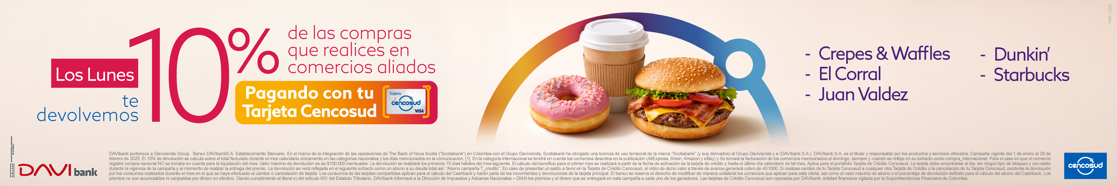 ®Marca registrada de The Bank of Nova Scotia, utilizada bajo licencia. Scotiabank Colpatria Establecimiento Bancario. Campaña vigente del 1 de septiembre al 31 de diciembre de 2025. El 10% de devolución se calcula sobre el total facturado durante el mes calendario únicamente en las categorías nacionales y los días mencionados en la comunicación. La devolución se realizará los primeros 15 días hábiles del mes siguiente. El cálculo del beneficio para el primer mes se realizará a partir de la fecha de activación de la tarjeta de crédito y hasta el último día calendario de tal mes. Aplica para el portafolio Tarjeta de Crédito Cencosud Scotiabank Colpatria. La tarjeta debe encontrarse al día, sin ningún tipo de bloqueo y con saldo durante la vigencia de la campaña y al momento de realizar la entrega del premio. La devolución se verá reflejada en el siguiente extracto como un abono a su deuda total así: “Abono campaña T_credito”, En caso de presentar un saldo a favor en la Tarjeta de Crédito Cencosud, el retiro de dicho valor a través de avance generará cobro de 4X1000. Si realizas cambio de tu Tarjeta Cencosud a cualquier otra Tarjeta de Crédito o la cancelación de tu Tarjeta Cencosud, perderás la devolución por los consumos realizados durante el mes en el que se haya efectuado el cambio o cancelación de tarjeta. Los consumos de las tarjetas compartidas aplican para el cálculo del Cashback y harán parte de los movimientos y devoluciones de la tarjeta principal. El banco se reserva el derecho de modificar de manera unilateral los comercios que aplican para esta oferta, así como el valor máximo de abono o el porcentaje de devolución definido para el cálculo del abono del Cashback. Los premios no son acumulables ni canjeables por dinero en efectivo. Dando cumplimiento al literal E del artículo 631 del Estatuto Tributario, Scotiabank Colpatria informará a la Dirección de Impuestos y Aduanas Nacionales DIAN, el dinero que se entregará en esta campaña en caso de ser uno de los ganadores. Has recibido este email porque autorizaste a Scotiabank Colpatria el envío de comunicaciones con contenido comercial de conformidad con la política de tratamiento de datos. Las Tarjetas de Crédito Cencosud son operadas por Scotiabank Colpatria, entidad financiera vigilada por la Superintendencia Financiera de Colombia.