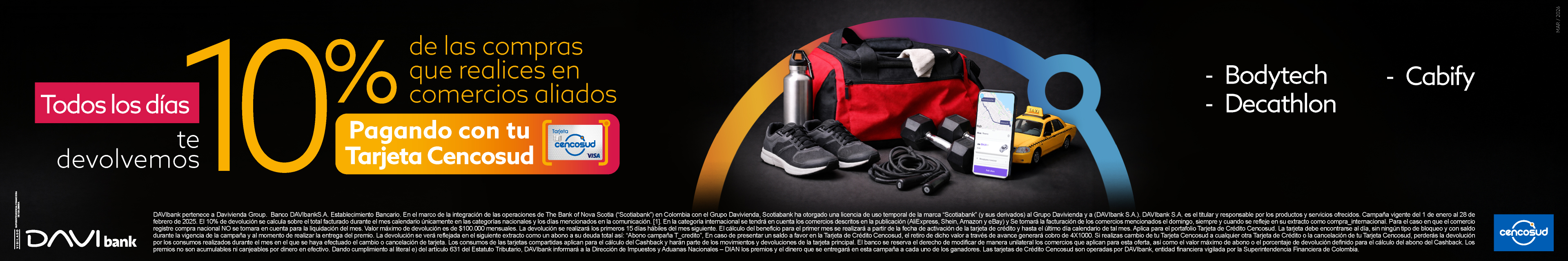 DAVIbank pertenece a Davivienda Group. Banco DAVIbankS.A. Establecimiento Bancario. En el marco de la integración de las operaciones de The Bank of Nova Scotia (“Scotiabank”) en Colombia con el Grupo Davivienda, Scotiabank ha otorgado una licencia de uso temporal de la marca “Scotiabank” (y sus derivados) al Grupo Davivienda y a (DAVIbank S.A.). DAVIbank S.A. es el titular y responsable por los productos y servicios ofrecidos. LUNES (mercado Jumbo y Metro): Aplica en referencias seleccionadas de las secciones de aseo hogar, aseo personal y categorías seleccionadas de alimentos. No aplica en: arroces, aceites, conservas de pescado ni alimentos infantiles. Máximo una (1) transacción por cliente, máximo dos (2) unidades de la misma oferta por transacción por día. MARTES (Jumbo frutas y verduras): Aplica para todos los productos de estas categorías. MIÉRCOLES (Jumbo carne): No aplica Costilla de res ni JUMBOPACKS. JUEVES (Jumbo pescadería): No aplica Marca Blanca ni elaboración propia. Marca blanca corresponde a los productos que no tienen ninguna marca comercial en su empaque. Elaboración propia corresponde a los productos que sufren algún tipo de transformación directamente en la tienda para su presentación final. VIERNES (Jumbo charcutería): No aplica Koller ni Delipavo. SÁBADOS (Jumbo parrilla): Aplica sobre chorizos, morcillas, hamburguesas, vacíos Cuisine & Co, matambrito de cerdo y carne importada de la sección Carnicería. EASY (10% descuento primera compra): Máximo 10 unidades por cliente. No aplica para las marcas de Corona, Grival, Socida, Insafe, Grifor, en las categorías de acero, cementos y agregados, cobre, alambre y cable de cobre, ladrillos, láminas de gyplac, superboard y mdf , llantas Rin 13. No acumulable con otros descuentos, ni productos publicados en catálogos. Aplica en tiendas físicas de Easy. El tarjetahabiente debe solicitar el 10% en su primera compra al asesor de tarjeta o servicio al cliente de Easy, y entregar el código asociado a la primera transacción con su Tarjeta Cencosud. TARJETA CENCOSUD: El descuento ofrecido no es acumulable con otros descuentos, ofertas ni dinámicas. No aplican productos de folletos vigentes. Sujetos a disponibilidad de la tienda. Máximo 2 transacciones por clientes, máximo 2 unidades de la misma oferta por transacción por día. En el evento de existir concurrencia de descuentos o beneficios, se otorgará el más favorable para el cliente. Se reservará la potestad de cambiar las fechas establecidas de las dinámicas a su entera potestad; de igual manera, se podrá suspender temporalmente o de manera definitiva la presente dinámica. La presente dinámica no estará activa los días de dinámicas especiales tales como, pero sin limitarse, JUMBO al 100%. No aplica para clientes mayoristas, entiéndase como cliente mayorista el cliente que compre más de ocho unidades de la misma oferta. No aplican productos identificados como precios bajos todos los días, ni Jumbo Packs ni Metro Packs. Aplica en línea de cajas o al finalizar la compra. No aplica para domicilios telefónicos ni pagos contra entrega. No aplican compras Metro Almacén. No aplican productos de Marketplace, solo aplican productos comercializados, facturados y entregados por Cencosud Colombia S.A. En el evento de modificarse o suspenderse temporal o definitivamente cualquiera de los términos y condiciones de estas ofertas, se comunicará a los clientes oportunamente. COMERCIOS: El 10% de devolución se calcula sobre el total facturado durante el mes calendario únicamente en las categorías nacionales y los días mencionados en la comunicación. En la categoría internacional se tendrá en cuenta lo siguiente: 1. Los comercios descritos en la publicación (AliExpress, Shein, Amazon y eBay). 2. Se tomará la facturación de los comercios mencionados el domingo, siempre y cuando se refleje en su extracto como: “compra_internacional”. Para el caso en que el comercio registre compra nacional NO se tomara en cuenta para la liquidación del mes. valor máximo de devolución es de $100.000 mensuales. La devolución se realizará los primeros 15 días hábiles del mes siguiente. El cálculo del beneficio para el primer mes se realizará a partir de la fecha de activación de la tarjeta de crédito y hasta el último día calendario de tal mes. La tarjeta debe encontrarse al día, sin ningún tipo de bloqueo y con saldo durante la vigencia de la campaña y al momento de realizar la entrega del premio. La devolución se verá reflejada en el siguiente extracto como un abono a su deuda total así: “Abono campaña T_credito”, En caso de presentar un saldo a favor en la Tarjeta de Crédito Cencosud, el retiro de dicho valor a través de avance generará cobro de 4X1000. Si realizas cambio de tu Tarjeta Cencosud a cualquier otra Tarjeta de Crédito o la cancelación de tu Tarjeta Cencosud, perderás la devolución por los consumos realizados durante el mes en el que se haya efectuado el cambio o cancelación de tarjeta. Los consumos de las tarjetas compartidas aplican para el cálculo del Cashback y harán parte de los movimientos y devoluciones de la tarjeta principal. El banco se reserva el derecho de modificar de manera unilateral los comercios que aplican para esta oferta, así como el valor máximo de abono o el porcentaje de devolución definido para el cálculo del abono del Cashback. Los premios no son acumulables ni canjeables por dinero en efectivo. Dando cumplimiento al literal E del artículo 631 del Estatuto Tributario, Scotiabank Colpatria informará a la Dirección de Impuestos y Aduanas Nacionales DIAN, el dinero que se entregará en esta campaña en caso de ser uno de los ganadores. Has recibido este email porque autorizaste a Scotiabank Colpatria el envío de comunicaciones con contenido comercial de conformidad con la política de tratamiento de datos. La compra está sujeta a disponibilidad del cupo de la tarjeta y debe 